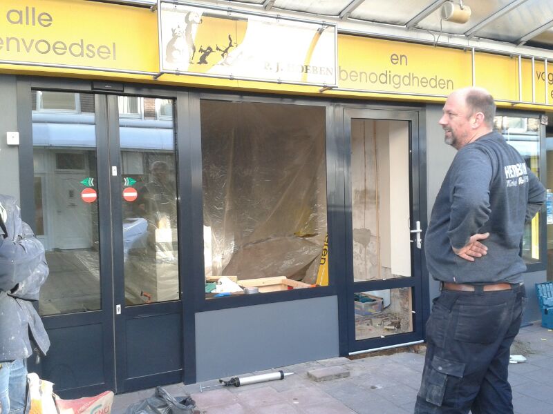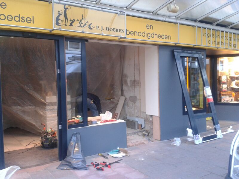 Bij dierenspeciaalzaak Hoeben is er een nieuwe pui in de winkel gezet. Hier ziet men een paar foto's van de werkzaamheden en het eindresultaat: